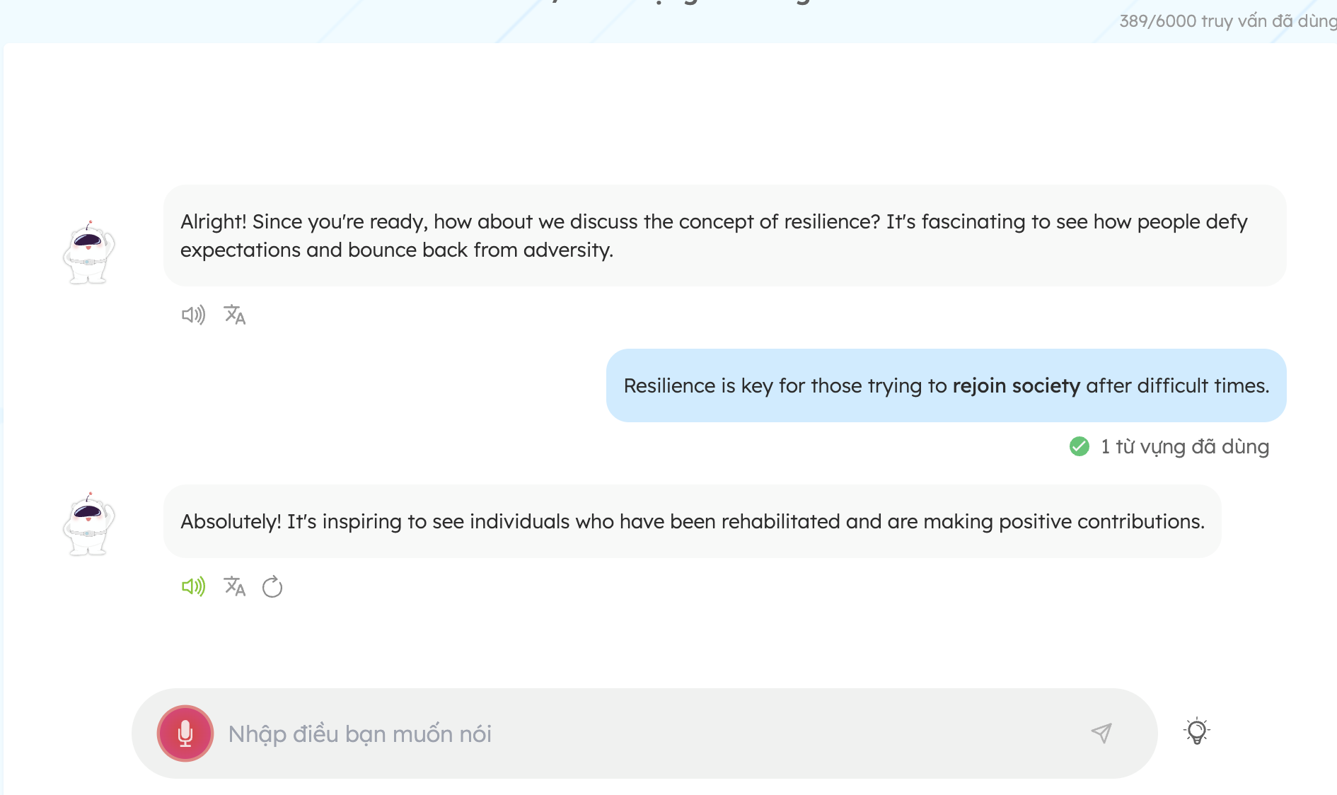 Bạn không cần “chờ giỏi rồi mới nói”. Giai đoạn này, bạn cũng chưa cần đặt áp lực phải nói hay và nói chuẩn,. Chỉ cần mở miệng ra và nói theo gợi ý của AI đã là một bước tiến rất lớn rồi.