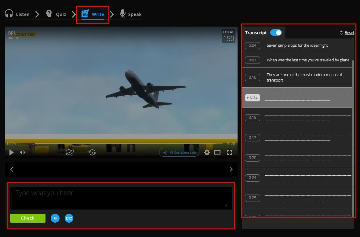 Listen to each dialogue line and write down what you hear. eJOY will show you your mistakes. This feature will help to improve your writing and listening skills.