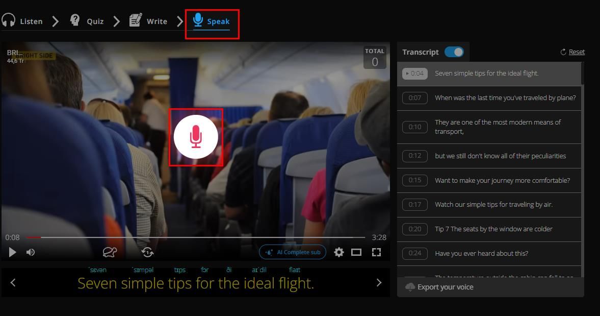 Record your voice and eJOY will analyze it and show you your pronunciation mistakes. You can playback your recording and compare it to the original voice in the video.