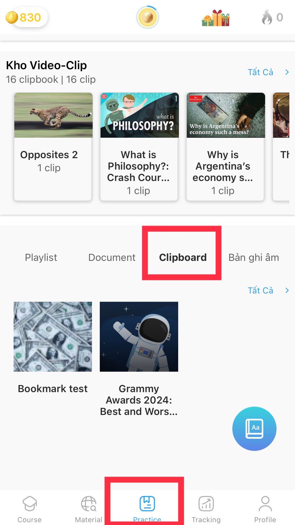 To find the clips you have saved, go to the Practice section and select Clipboard.