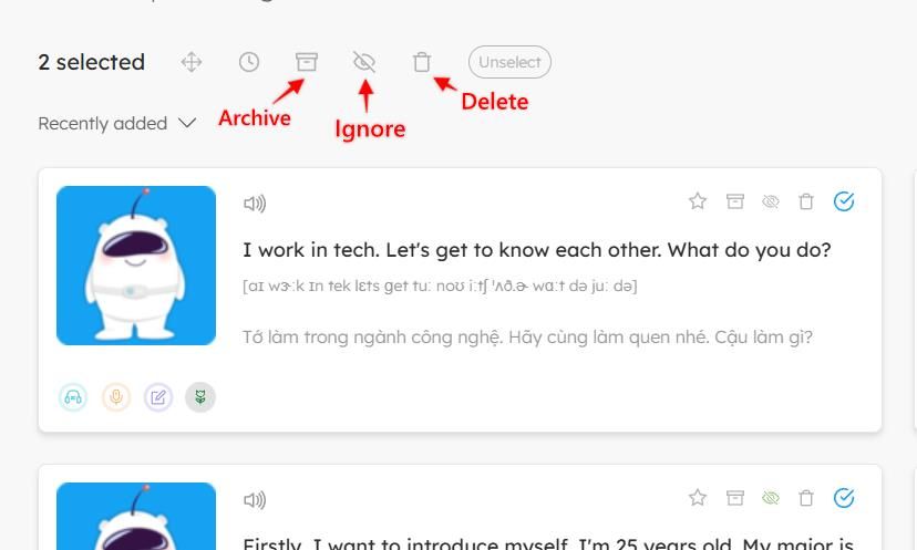 - Archive cards (hide from wordbook but keep them stored) → Click the Archive icon