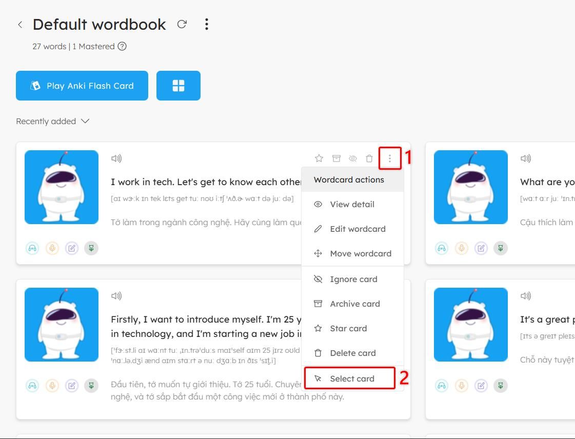 Step 1: Open the wordcard action menu