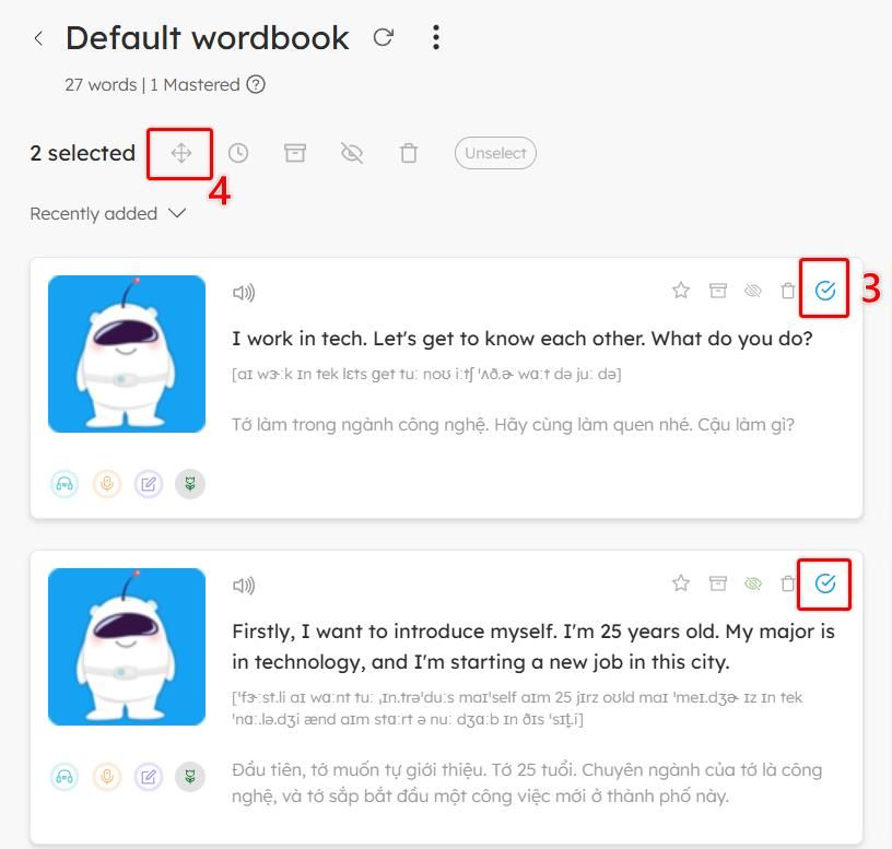 You can select multiple vocabulary cards and move them to another wordbook in just a few simple steps.