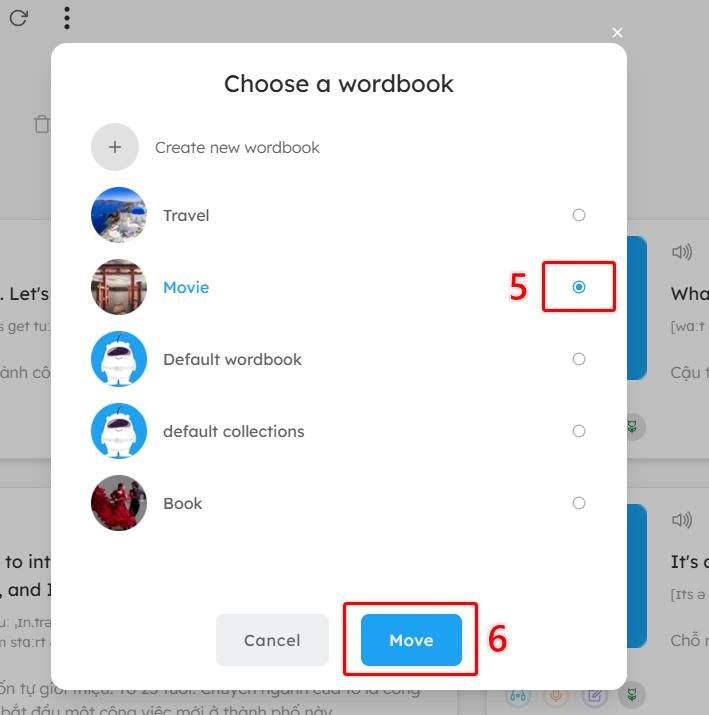 In the pop-up window, select the wordbook where you want to move the selected cards.