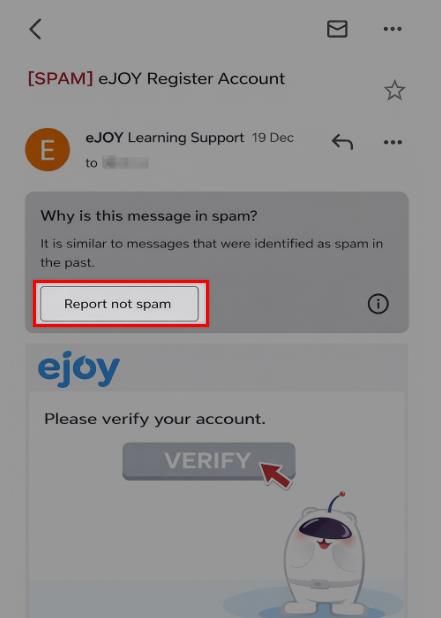 When you sign up for an eJOY account using your email address, we immediately send a verification email to the address you provided. You must open that email and click the “Verify” button to complete the verification process and activate your account.