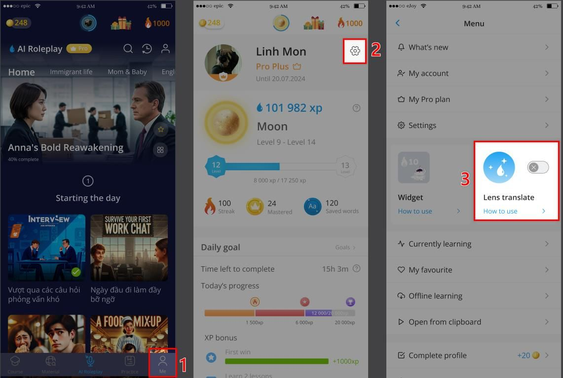 - Settings: Go to Profile => Select LensSettings to switch translation modes, change languages, or review the user guide.