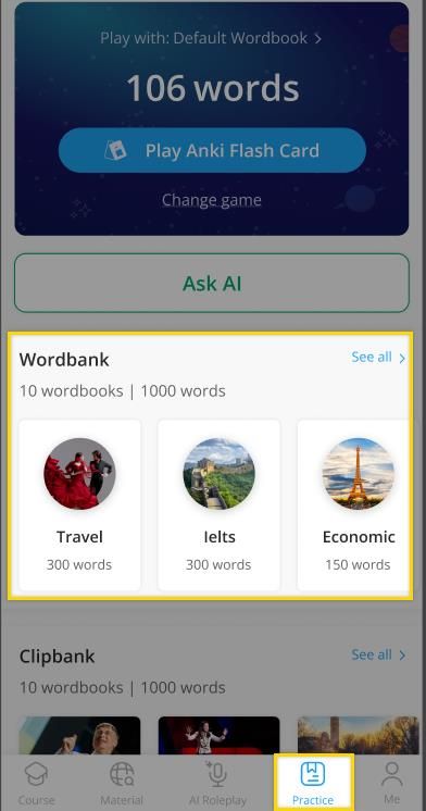 - Cách 2: Vào mục Practice → Bấm All tại Wordbank → Chọn biểu tượng thêm sổ từ → Nhập tên và ảnh mô tả → Bấm Save