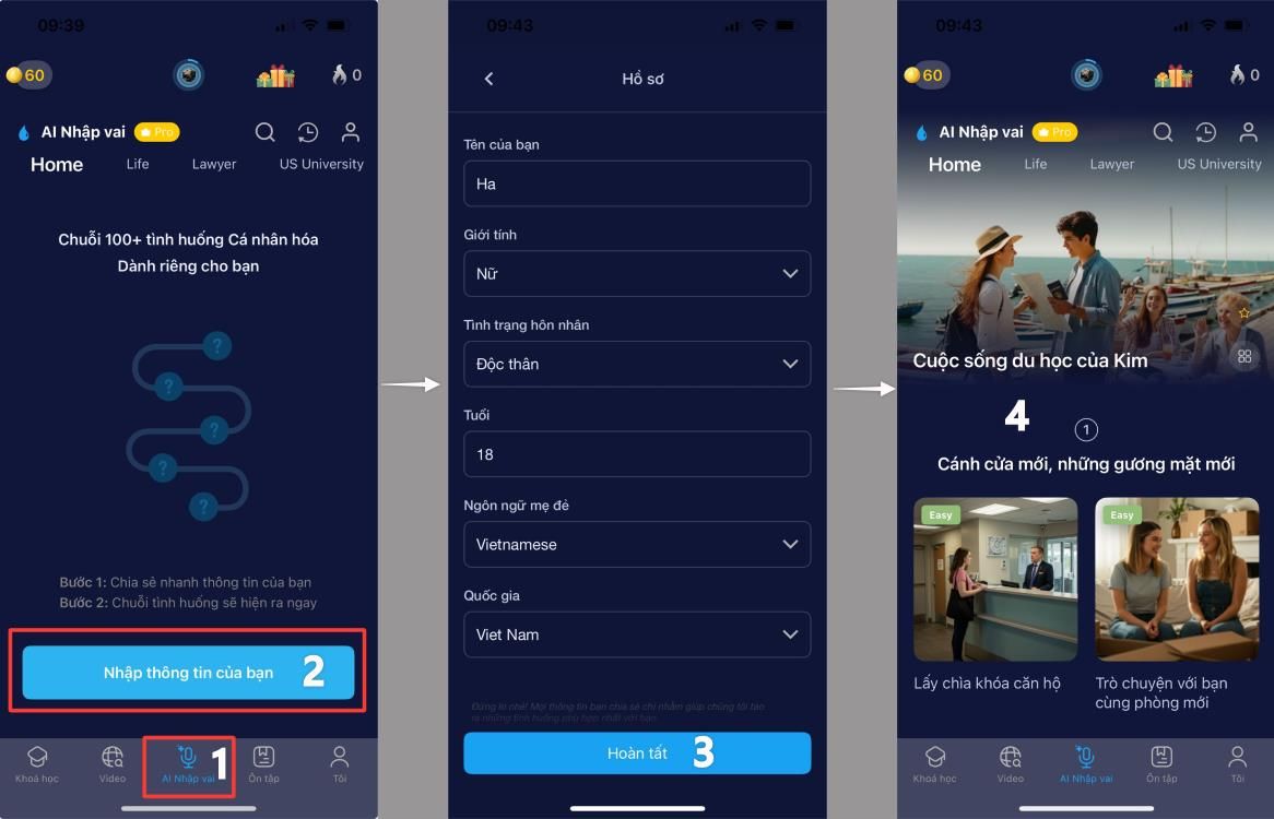 Đây là một không gian luyện nói tiếng Anh cùng AI, được cá nhân hóa 100% dựa trên thông tin và mục tiêu học tập của bạn. Bạn sẽ được luyện nói trong hàng trăm tình huống thực tế như: Phỏng vấn xin việc, Thuyết trình, Họp nhóm, Đàm phán với đối tác, Hỏi đường, Nói chuyện với con,... và hàng trăm tình huống khác.