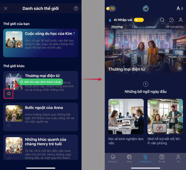 Nhấn vào biểu tượng ⭐ để chọn thế giới mặc định. Khi biểu tượng ⭐ chuyển sang màu vàng và xuất hiện thông báo xanh, bạn đã cài đặt thành công. Từ đó, giao diện chính (Home) sẽ luôn hiển thị theo thế giới mặc định này.